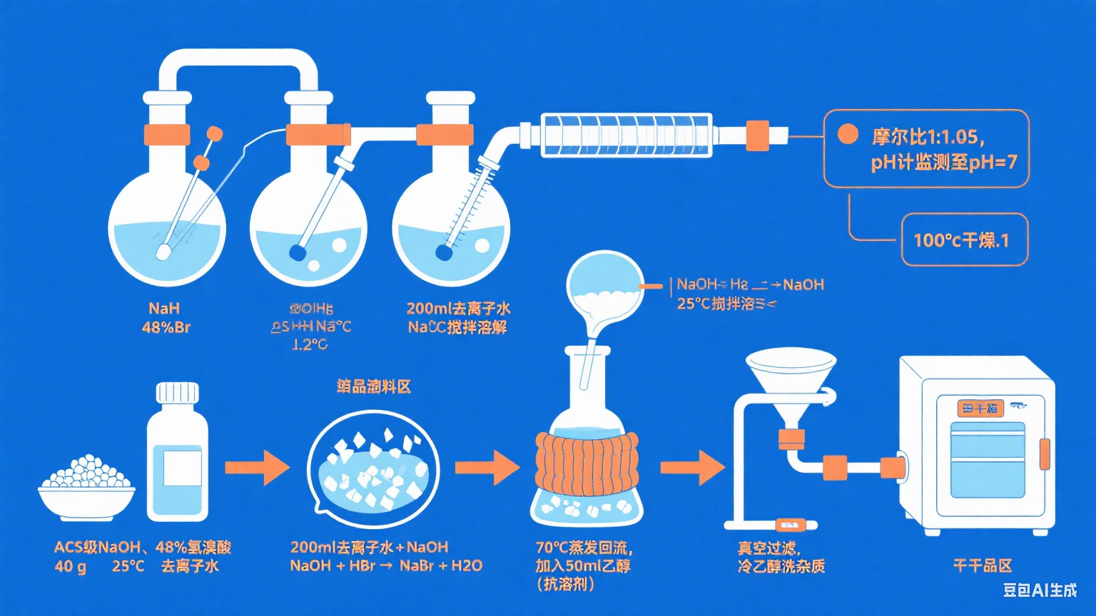 然后,將過濾后的溴化鈉晶體在100°C的干燥箱中干燥12小時。此步驟確保去除任何吸附的水分,得到無水產(chǎn)品。
